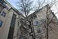 Первый этаж из-за рустовки и цвета контрастирует с другими этажами, кроме того, он отделён от остальных этажей поясом-карнизом.