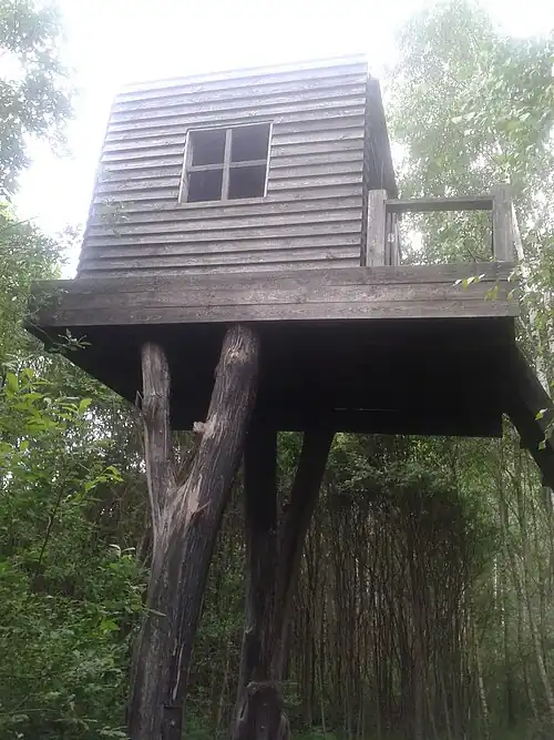 Арт-объект представляет собой маленький деревянный дом кубической формы, размещённый на прямоугольной площадке из досок, на 6 метров поднятой над землёй. Опорами для площадки служат два ствола мёртвых вязов и крутая деревянная лестница, по которой только и можно подняться в домик. В трёх стенах дома сделаны окна без стёкол, в четвёртой, со стороны лестницы, — дверь. Небольшое пространство между верхом лестницы и дверью выполняет роль маленькой смотровой площадки. Внутри дома находятся две скамьи от стены до стены и стол по центру.