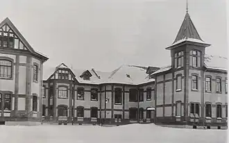 Внутренние помещения отражены снаружи выступами и креповками, у здания есть скошенные и закруглённые углы, ни один из фасадов не выделяется как главный. Корпус с палатами по углам украшен прямоугольными башенками с пирамидальными шатрами, на фасадах чередуются треугольные и срезанные полувальмами трапециевидные щипцы[5], заполненные неповторяющейся имитацией фахверка, декорацией из накладных досок с прямоугольной сеткой, диагональными крестообразными или изогнутыми веерами штрихами и резьбой с четырёхлистниками. Стены были покрыты светлой штукатуркой, на которой выделялись детали из красного кирпича — рамочные оконные наличники, тяги, лопатки[6]. Кроме основного здания, рядом с том же стиле были построены дом администрации (1913 год) и флигель для семейных инвалидов, оба строения не сохранились. После начала Первой Мировой войны сам Данини сделал несколько пристроек, исказивших изначальную композицию главного здания[7]. Также рядом были возведены различные постройки, в том числе к 1917 году было построено 10 небольших одноэтажных бетонитовых домика с двускатными крышами по проекту военного инженера К. Д. Грибоедова; сохранилось три дома из этих десяти[3].