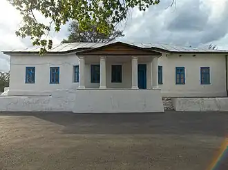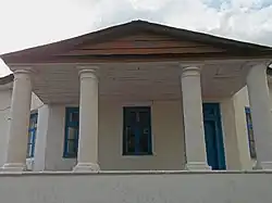 Здание размером 22,9×11,7 м. Главный фасад имеет трапециевидный ризалит шириной 6,5 м выступает на 1,5 м, переходящее в крыльцо с двускатной крышей, поддерживающей 4 круглые колонны на квадратной базе линии фронтона. Крыльцо оборудовано на платформе высотой 1,8 м, которая выступает на 5 м за линию фасада. Слева от крыльца утоплены ступени для подъёма на уровень парадного входа. Справа к боковому фасаду примыкает 2-этажное здание школы 20-го века. К чёрному входу с другого торца здания примыкают кирпичные ступени и платформа-гульбище с бордюром высотой 0,5 м. Тыльный фасад без пристроек. Стены побелены, оконные рамы деревянные решётчатые, крыша железная.