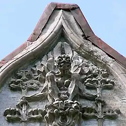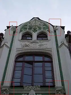 | Зеленоглазая кошка, стерегущая окно | Две совы над дверью | Чёрт или Химера на самом верху, под крышей | Фамильный герб, расположенный под Чёртом | Четыре мужских маскарона: 2 грустных, 2 злых |