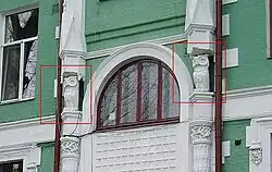 | Полукруглое окно-витраж — соединение модерна и готики[5] | Двустворчатая дверь с ажурными литыми перилами | Вытянутые прямоугольные окна, подчеркивая высоту и формируя с другими элементами ровные линии, придают архитектуре здания, в том числе и готический вид |