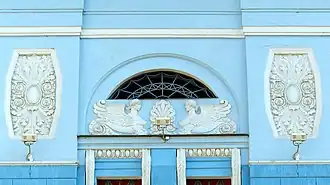 Главный фасад и интерьер вестибюля оформлены дорическим ордером с «трофеями» в метопах. Портал украшен симметричными фигурами Славы. Штукатуренный фасад на уровне второго этажа украшен декоративными портиками с вазами, аттик — грифонами и обелисками. Цоколь облицевали тесаным гранитом[1].