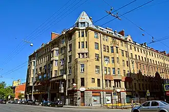 Шестиэтажное здание построено А. Ф. Бубырём в 1911—1912 годах для Латышской лютеранской церкви Христа Спасителя (сама церковь не сохранилась). Городские власти изначально были против сооружения, так как палисадники чётной стороны Загородного проспекта не застраивались, а по плану это здание должно было его занять; была сделана попытка выкупить землю, составлен план урегулирования (расширения) проспекта[1], но в итоге частные интересы оказались сильнее градостроительного регулирования, и план был согласован[2].