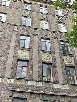 На дальнем боковом фасаде со стороны дома 13 по 12-й линии на уровне 5-6 этажей 2022 год сохранились восьмиугольные стеклоблоки Фальконе[3].