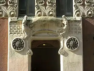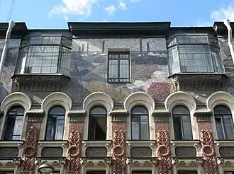 На нижнем этаже сделаны витрины магазинов[4], на верхнем этаже — спланированы художественные ателье, на фасаде проявленные[2] четырьмя трёхгранными[4] стеклянными фонариками. Гигантский фриз сделан мозаикой в технике укрупнённого набора[2] (всего пять панно[4] по эскизам С. Т. Шелкового, выполненные мастерской В. А. Фролова[5]). Три жилых этажа объединены пилястрами и двумя округлыми эркерами. Здание обильно украшено лепными украшениями, в том числе двумя женскими фигурами, сандриками, архивольтами[4].