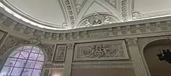 У лестницы-фонарика есть промежуточная криволинейная площадка[3], она освещена полукруглыми окнами и перекрыта полукуполом, переходящим в свод. Её высокий цоколь имитирует каменную кладку, стены над ним членятся коринфскими пилястрами с барельефами на лицевой поверхности. По границе купола и свода сделана полоса розеток, также в украшении помещения использован карниз на вертикальных кронштейнах, широкий скульптурный орнаментальный фриз-панно[6].