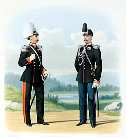 2. Илл. 585. Штаб-Офицер л.-гв. Драгунского и Обер-Офицер (Адъютант) 2-го л.-гв. Драгунского Псковского Ея Величества полков. (вседневные формы) 2 Января 1874 // Перемены в обмундировании и вооружении войск Российской Императорской армии с восшествия на престол Государя Императора Александра Николаевича (с дополнениями) : Составлено по Высочайшему повелению / Сост. Александр II (император российский), илл. Балашов Петр Иванович и Пиратский Карл Карлович. СПб.: Военная типография, 1857—1881. — Тетради 1—111 : (С рисунками № 1—661). — 47×35 см.