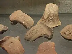 - Концентрические круги (обычно два, иногда только один; иногда наносятся на нештампованные ручки, но неизвестно, были ли они когда-либо вырезаны на нештампованных сосудах)