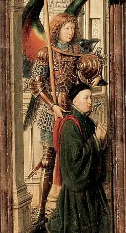 К плечу юного архангела Михаила прислонено копьё[35]. Святой одет в искусно украшенные драгоценностями цветные доспехи, его левая рука держит шлем[26], а правая лежит на плече донатора, коленопреклонённого перед Богородицей. Руки донатора тянутся вверх как при молитве, однако ладони не соприкасаются друг с другом. На его правом мизинце изображено золотое кольцо[23], а сам он одет в длинный гупелянд оливкового цвета[5], который в то время был на пике моды и подтверждал высокий статус донатора при Бургундском дворе[12]. Платье имеет высокий воротник с меховой подкладкой и глубокие мешковатые рукава с меховой отделкой. Заказчик подстрижен «под горшок», с закруглёнными по краям и сбритыми над ушами волосами, что было типично для нидерландской моды середины 1430-х годов. За исключением красного капюшона его наряд напоминает одежду жениха с картины «Портрет четы Арнольфини»[36].