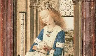На правой панели ван Эйк изобразил Екатерину Александрийскую в образе готической принцессы. Она стоит, читая книгу в «восхитительной скромности»[4], её светлые волосы распущены, а голова увенчана изысканной драгоценной короной, очень похожей на корону с картины «Мадонна канцлера Ролена». Насыщенно-синее платье и табард из белой драпировки горностаевого меха дополняют образ принцессы. На её шее висит золотая цепочка с драгоценным кулоном. Художник включил в образ Екатерины Александрийской все традиционно связанные с ней атрибуты. В правой руке она держит меч, которым она была обезглавлена, а у её ног лежит колесо, на котором её пытали[32]. Подобно женскому образу в «Портрете четы Арнольфини», фигура Екатерины «модно грушевидна». Хит отмечает, что её одеяние «более ослепительно, чем Богородицы» и сравнимо с роскошной бронёй архангела Михаила на левом крыле триптиха[33].