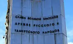На правом и левом пилонах, в нижней части на двух языках (русском и удмуртском) написана фраза «Слава великой братской дружбе русского и удмуртского народов».