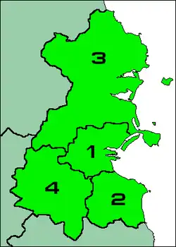 | 2 | Дун-Лэаре-Ратдаун | 127,31 км2 (49 кв. миль) | 206 261 |