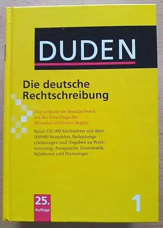 С 1956 по 1996 год словарь правописания (нем. Rechtschreibduden) определял официальную орфографию немецкого языка в Германии, однако с проведением реформы орфографии в 1996 году монопольная власть словаря была утрачена. Его конститутивное значение ныне ограничивается лишь некоторыми сферами применения языка, в целом же (по решению Федерального конституционного суда) свобода выбора источника орфографических правил в литературе, публицистике и отчасти в науке остаётся за автором. Грамматика «по Дудену» не везде признаётся нормативной, особенно с учётом различных диалектов немецкого языка, где существуют собственные нормы (Австрийский словарь, Швейцарский идиотикон).