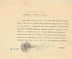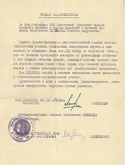 - 1 2 Наградной лист в электронном банке документов «Подвиг народа» (архивные материалы ЦАМО. Ф. 33. Оп. 690155. Д. 3442. Л. 5).