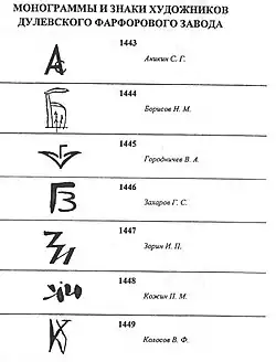 - ↑ Мусина Р.Р. Марки российского фарфора (1744-1917). — М.: Знание, 1995. — С. 36, 37. — 80 с. — ISBN 5-07-002646-1.
