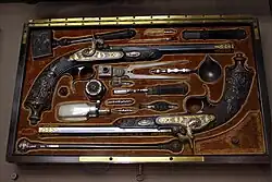 Видов дуэлей на пистолетах существует больше, чем на холодном оружии. Во всех случаях для дуэли использовались парные однозарядные пистолеты. Оружие не должно было быть знакомым никому из противников, этому придавалось большое значение, так как до эпохи массового промышленного производства каждый экземпляр оружия имел выраженные индивидуальные особенности, и знакомый с пистолетом дуэлянт мог получить серьёзное преимущество[2]. В некоторых дворянских домах держали отдельный набор пистолетов нарочно на случай дуэли, и ни для чего другого их не использовали. Противники приезжали на поле чести каждый со своей парой пистолетов, свидетельствовали честным словом, что оружие не пристреляно, затем жребием определяли, из чьих пистолетов стреляться.[3]
