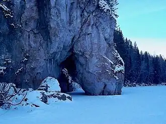 Известняковая скала с оригинальной карстовой аркой у основания, один конец которой уходит в реку, а другой – в берег реки. Высота просвета арки составляет около 4 метров. Скала состоит из серых слоистых известняков. Со стороны реки напоминает склоненную голову лошади, пьющей воду. У камня расположена пещера протяженностью 15–17 метра. Комплекс скальной флоры. Место туризма и экскурсий[1]. Скала является геоморфологическим и ботаническим природным памятником[2].