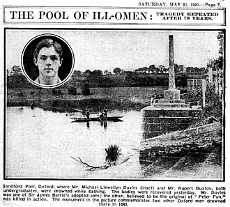 Незадолго до 21-го дня рождения Майкла он и Бакстон 19 мая 1921 года утонули вместе во время купания в водоёме Сэндфорд-Пул возле плотины Сэндфорд-Лок на Темзе в нескольких милях от Оксфорда. Обстоятельства смерти были весьма странными: водоём Сэнфорд-Пул был действительно опасным местом для купания и там были установлены предупредительные знаки, о которых Дэвис и Бакстон прекрасно знали, но всё равно плавали там и прежде. Глубина водоёма составляла 6—9 метров, но вода в тот день была спокойной. Майкл Дэвис страдал небольшой аквафобией и не умел хорошо плавать, в то время, как Бакстон, наоборот, был хорошим пловцом. Следствие по этому делу вышло на некоего свидетеля, который заявил, что застал, судя по всему, Дэвиса и Бакстона в тот момент, когда один человек сидел на камне у плотины, а второй бросился в воду, чтобы доплыть до него, но испытывал какие-то «трудности», и тот, что сидел на камне, спустился в воду и поплыл ему навстречу. По словам свидетеля, когда оба были в воде, не было похоже, что они борются или как-то сопротивляются друг другу. Тела обоих были найдены на следующий день и в «сложенном» положении. В заключении коронера по делу говорилось, что Дэвис утонул случайно, а Бакстон — при попытке спасти друга[1][5]. В некоторых более поздних сообщениях упоминалось, что руки погибших были привязаны друг к другу, однако в сохранившихся до настоящего времени источниках об этом ничего не сказано[6]. Поскольку пара была очень близка, появилась версия о суициде, который оба спланировали заранее. Роберт Бутби в 1976 году писал о том, что с появлением Руперта Бакстона в жизни Майкла началась «почти убийственная полоса», однако не высказал никаких предположений о том, умер ли Бакстон, пытаясь спасти Дэвиса, или же их смерть была результатом сговора[2].