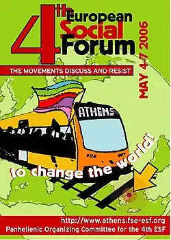 Третий социальный форум прошел в Лондоне в октябре 2004 года и собрал 25 000 человек из 70 стран[8]. Важную роль в его работе принимала Социалистическая рабочая партия. Четвертый соцфорум прошел уже почти через 2 года — в мае 2006 в Афинах. В его ходе 7 мая была проведена демонстрация, в которой участвовали 80 тысяч человек; важную роль в организации форума играла Коалиция радикальных левых (СИРИЗА).