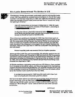 В 2004 года, в ходе работы Комиссии 9/11, которая была создана для анализа терактов 11 сентября 2001 года, после заслушивания показаний тогдашнего советника по национальной безопасности Кондолизы Райс 8 апреля 2004, Комиссия призвала рассекретить PDB от 6 августа 2001 года, озаглавленное «Бин Ладен намерен атаковать США» (англ. Bin Ladin Determined To Strike in US). Два дня спустя, Белый дом опубликовал этот документ с минимальными редакционными правками.