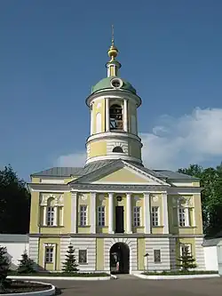 Надвратная колокольня с церковью Дмитрия Ростовского — образец архитектуры зрелого классицизма рубежа XVIII—XIX веков. Колокольня сложена из кирпича и белого камня и по форме представляет собой удлинённый корпус в два этажа со звонницей. Служебные постройки и братские корпуса выглядят скромно и завершают архитектурный ансамбль монастыря. Монастырь обнесён каменной оградой с двумя уцелевшими угловыми башнями[27][8].