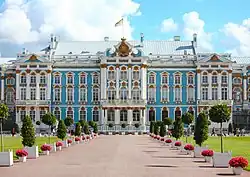 В царствование Елизаветы Петровны Царское Село стало императорской резиденцией. В 1740—1750-е годы скромный дворец Екатерины I перестраивается в роскошную летнюю резиденцию. С 1744 года по замыслу архитектора А. В. Квасова старое петровское здание было переделано, надстроено и связано галереями с двухэтажными флигелями по бокам. Вскоре эту работу продолжил русский зодчий С. И. Чевакинский. Дворец состоял из трёх корпусов, церкви и оранжерейного зала, соединённых между собой галереями[7]. Через несколько лет и новый дворец показался недостаточно парадным и было решено его вновь переделать. С 1751 года по 1756 год реконструкцию Екатерининского дворца вёл архитектор Ф. Б. Растрелли. Работы велись круглый год, реконструкция потребовала огромных средств. Растрелли поднял галереи до уровня корпусов и с исключительным богатством и пышностью отделал фасады. В основных чертах дворец и сейчас имеет облик, который был придан ему Растрелли. В 1755 году из третьего Зимнего дворца сюда перенесли Янтарный кабинет. Параллельно с дворцом по проекту Растрелли в парке строятся павильоны «Эрмитаж», «Грот» и «Зал на острову» посредине Большого пруда для увеселительных собраний узкого круга придворных. Одновременно шло расширение территории сада, южной границей его стали Нижние пруды[2][8]. Для придания саду должного великолепия в него были перенесены статуи, а также широко практиковалась пересадка многолетних деревьев из петербургских садов. Наряду с этим в саду высаживались молодые деревья. Декоративные деревья и кустарники покупались и за границей. В 1751—1752 годах деревянные решетчатые заборы были заменены высокой каменной оградой с воротами по проекту Растрелли. В 1754—1757 годах близ дворца, на месте нынешней Гранитной террасы, по проектам А. К. Нартова и Растрелли было построено здание Катальной горки[6].