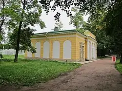 Концертный зал в юго-западной части парка сооружен в 1782—1788 годах по проекту архитектора Д. Кваренги. Прямоугольный в плане, с выступающим вперёд портиком-ротондой зал обработан очень строго: гладкие стены, прорезанное оконными проёмами без наличников, оживлены лишь лепным фризом с гирляндами и головами жертвенных быков. В глубине за колоннадой портика стены украшены барельефами работы скульптора М. И. Козловского. Внутри он был отделан искусственным мрамором, а пол украшала подлинная римская мозаика I века н. э.[2].