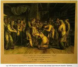 - ↑ Картинка; грав. резцом, с подписью: "Р. И. Акимов — Грав. А. Екимов. Его Императорскому Высочеству Государю Цесаревичу и Великому Князю Константину Павловичу, всепокорнейшее приношение. Изображение Государя Императора Петра Великаго, приемлющего просьбу
