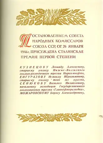 - Сталинская премия второй степени (1950) — за открытие месторождений нефти— за открытие месторождений нефти