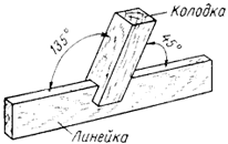 Ерунок представляет собой колодку, в которую под углом 45 градусов вставлена линейка. При разметке ерунком его нужно приложить к доске так, чтобы находящаяся под линейкой часть колодки плотно прилегала к боковой стороне заготовки, а сама линейка плотно лежала на горизонтальной поверхности. В качестве средства нанесения линии или риски используют карандаш или острое шило.