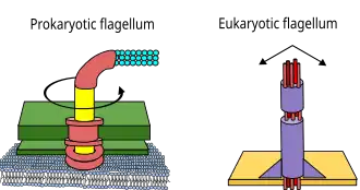 Строение жгутика бактерий фундаментально отличается от строения жгутика эукариот. Если эукариотический жгутик представляет собой вырост клетки, окружённый мембраной, с элементами цитоскелета внутри, который движется за счёт энергии гидролиза АТФ, то бактериальный жгутик (как и жгутик архей) вмонтирован в оболочку клетки и вращается за счёт энергии трансмембранного градиента протонов или ионов натрия. Кроме того, в отличие от эукариотических жгутиков, основной тип движения которых — биение, жгутики бактерий вращаются[9]. Жгутики бактерий и архей состоят из двух независимых частей — ротора и статора[10].
