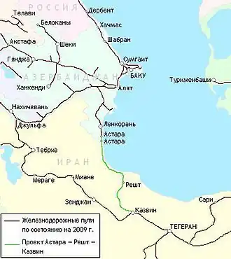 - ↑ Азербайджан, Россия и Иран подписали соглашение о строительстве железнодорожной магистрали Казвин-Решт-Энзели-Астара // Day.az, 4 мая 2005 (недоступная ссылка)