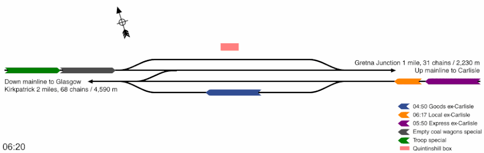 К моменту аварии обычное движение в северном направлении включало в себя пропуск двух пассажирских составов из Лондона в Глазго и Эдинбург, которые отъезжали из Карлайла в 5:50 и 6:05 соответственно. За ними следовал местный пассажирский поезд с остановкой во всех пунктах от Карлайла до Биттока. Этот пригородный поезд отправлялся из Карлайла в 6.10.