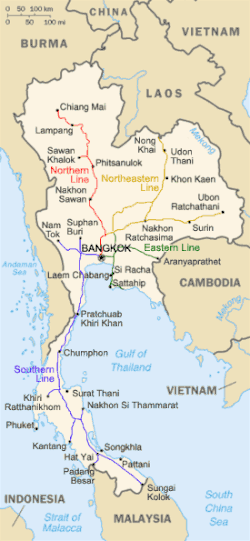 Центром основной железнодорожной сети государства является Бангкок. Главной пассажирской станцией является вокзал Хуалампхонг, являющийся конечной точкой большинства маршрутов. Крупнейшей грузовой станцией (при которой также размещено локомотивное депо) является узловая станция Бангсы в северной части Бангкока.
