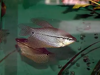 Жемчу́жный гура́ми[1] (лат. Trichopodus leerii) — один из видов лабиринтовых рыб. Относится к распространённым аквариумным рыбкам. Обитает в Индии, на Малайском архипелаге, в Индонезии — на Суматре и Борнео[2], а также в Таиланде[3] в мелких, густо заросших водоёмах[3]. Самец длиной до 12 см, самка немного мельче. У самца плавники длиннее и острее, окраска ярче, грудь и брюхо, особенно в возбуждённом состоянии, оранжево-красноватые. Мирные и довольно пугливые.