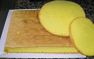 Тесто немедленно выкладывают на противень или в форму и выпекают в заранее разогретой печи до золотистой корочки. Готовый бисквит вынимают из формы и остужают[8].