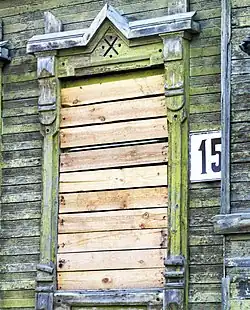 Все окна прямоугольные, украшены наличниками с прямыми профилированными сандриками на консолях из двух бриллиантовых накладок, боковыми стойками и подоконными досками. Декор стоек со свесами в виде капелек повторяет бриллиантовую накладку. Их лицевая сторона с боковыми фасками прорезана вертикальным желобком. Нижние края подоконных досок оформлены прямоугольными вырезами. Сандрики верхних окон завершены треугольникам по центру и их половинками по бокам. По этому же образцу, сандрики окон первого этажа в центре переходят в щипец с прорезным косым крестом и четырьмя круглыми отверстиями в тимпане[4].