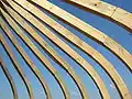 Собранный на земле деревянный каркас купола, состоящий из 32 журавцов