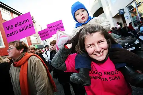 В 1980 году Вигдис Финнбогадоттир стала первой женщиной в мире, избранной на пост конституционного главы государства[5]. Позднее всеобщие забастовки женщин в Исландии проводились в 1985, 2005 и 2010 годах[6]. Исландия в 2020 году в 11-й раз подряд возглавила ежегодный рейтинг гендерного равенства, публикуемый Всемирным экономическим форумом с 2006 года, с индексом гендерного разрыва 88 %[9].