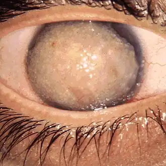 | Буллёзная кератопатия | нарушение функции эндотелия роговицы, ведущее к пропитыванию стромы жидкостью из передней камеры глаза с образованием характерных пузырьков | [5] | |