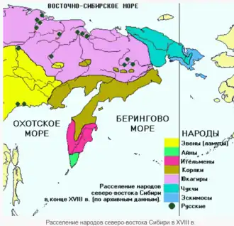 При дальнейшем продвижении русских казачьих отрядов степень сопротивления и ожесточённости аборигенов повышалась с запада на восток обратно пропорционально уровню их социально-экономического развития. По мнению А. С. Зуева, наиболее бескомпромиссную борьбу с русскими вели самые «дикие» племена — чукчи. Коряков и ительменов, в конечном счёте, удалось объясачить и привести в покорность, но чукчей подчинить так и не удалось. Первые встречи с чукчами ознаменовались вооружёнными столкновениями и в последующем отношения с ними были исключительно враждебными. Они не только отказывались идти в российское подданство и платить ясак, но и вели против русских активные боевые действия. К началу XVIII века численность чукчей составляла 8—9 тысяч человек. Занимаясь охотой, оленеводством и морским промыслом, чукчи не вышли ещё из каменного века. Деревянные, каменные и костяные орудия только в XVIII веке у них стали заменяться железными, добытыми торговлей или грабежом у соседей-инородцев и у русских. Архаизм хозяйства дополнялся неразвитостью общественных отношений[1].