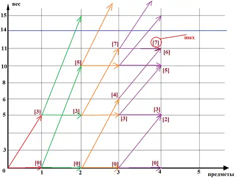 Проиллюстрировать решение методом динамического программирования можно следующим образом: на двумерной плоскости по оси откладывается количество предметов, по оси — их вес. На первом шаге из начала координат строятся две линии: горизонтальная, соответствующая тому, что первый предмет не был взят, и наклонная, соответствующая взятому первому предмету. Их проекции на ось равны весу предмета. На втором шаге опять строятся 2 линии, горизонтальная (второй предмет не был взят) или наклонная (второй предмет взят). Положим длину горизонтальных дуг равной нулю, а наклонных — ценности предмета[14]. Таким образом, любому решению задачи соответствует некоторый путь в построенном дереве. Задача сводится к нахождению пути максимальной длины[14]. Пусть вместимость рюкзака .