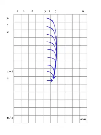 Алгоритм строит таблицу размера на n, содержащую значения рекурсии, где — сумма значений, а — число элементов. Когда вся таблица заполнена, возвращаем . Ниже приведена таблица P. На рисунке синяя стрелка из одного блока в другой, если значение конечного блока может зависеть от значения исходного блока. Эта зависимость является свойством рекуррентного отношения.