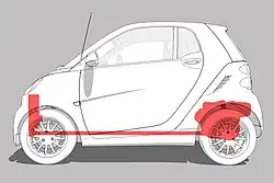 - Объём багажного отделения обычно меньше, чем при «классической» компоновке, из-за больших ниш передних (поворотных) колёс и расположения деталей рулевого управления;