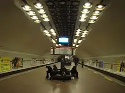 Посадочная платформа освещается светильниками с люминесцентными лампами. Светильники подвешены к потолку свода сплошным рядом по оси симметрии зала на несколько тяжёлых подвесных устройствах[3]. Светильники закрыты индивидуальными обрамлениями оригинальной художественной формы[9]. В 2007 году на станции вместо старых кольцевых люминесцентных повесили энергосберегающие светильники, с газонаполненными лампами. В ходе работ, проводившихся ночью, было заменено 600 светильников. А над эскалатором установили дополнительные светильники[10]. По всей длине станционной платформы размещены информационные стойки со скамейками отдыха для пассажиров[6]. Сверху информационных стоек с недавнего времени размещены видеоэкраны.