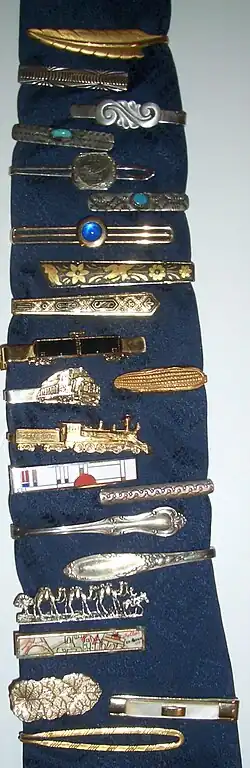 Зажим не позволяет галстуку выбиваться или раскачиваться, что обеспечивает более аккуратный и элегантный вид владельца. Зажимы для галстука обычно изготавливаются из металла (в том числе драгоценных металлов — золота и серебра) и часто имеют декоративные элементы и украшения, такие как гравировка или знаки принадлежности к какому-либо клубу, политической партии или корпорации. Некоторые зажимы для галстука представляют собой произведение ювелирного искусства.