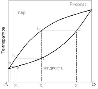 При нагревании исходной смеси состава Х1 кипение начнётся в точке а1. При этом состав первых порций пара соответствует точке b1. При конденсации этого пара образуется смесь состава Х2, в которой доля компонента А выше, по сравнению с исходной смесью. Нагрев этой смеси приведёт к получению конденсата состава Х3 и так далее, вплоть до выделения чистого компонента А. Отметим, что при кипении смеси состава Х1 состав жидкости будет обогащаться компонентом В, соответственно температура кипящей жидкости будет повышаться до тех пор, пока в жидкости не останется только компонент В. Последовательные перегонки в промышленных условиях объединены в один автоматизированный процесс в дефлегмационных и ректификационных колоннах.