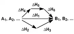 На рисунке приведено схематическое изображение некоторого обобщенного химического процесса превращения исходных веществ А1, А2… в продукты реакции В1, В2…, который может быть осуществлен различными путями в одну, две или три стадии, каждая из которых сопровождается тепловым эффектом ΔHi. Согласно закону Гесса, тепловые эффекты всех этих реакций связаны следующим соотношением: