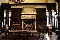 Самое большое помещение замка. Мощные дубовые колонны поддерживают потолок. Верхние части колонн покрыты резьбой (мотивы резьбы на всех колоннах различны). Верхняя часть камина украшена двумя скульптурами львов в рыцарских геральдический шлем. Зал украшают две картины: «Даная» школы Тициана и «Похищение сабинянок» — школы Пауля Рубенса (оригиналы картин экспонируются в художественной галерее Прадо, Мадрид. На старинном сундуке в стиле Ренессанс расположены японские, и напротив — китайские вазы. Мебель, собранная в этом зале, дает представление о жизни в XIX веке.